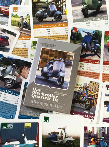 Dieses einzigartige Spiel beinhaltet 32 der schönsten Modelle der Rollerszene. Maschinen wie u. a. der französischen ACMA, IWL, Vespa, Heinkel oder auch der Simson Schwalbe begeistern heute noch jung und alt. Die Szene wächst mehr denn je, egal ob Sammler, Bastler oder einfach nur fÜr den passionierten Rollerfahrer.